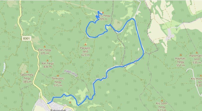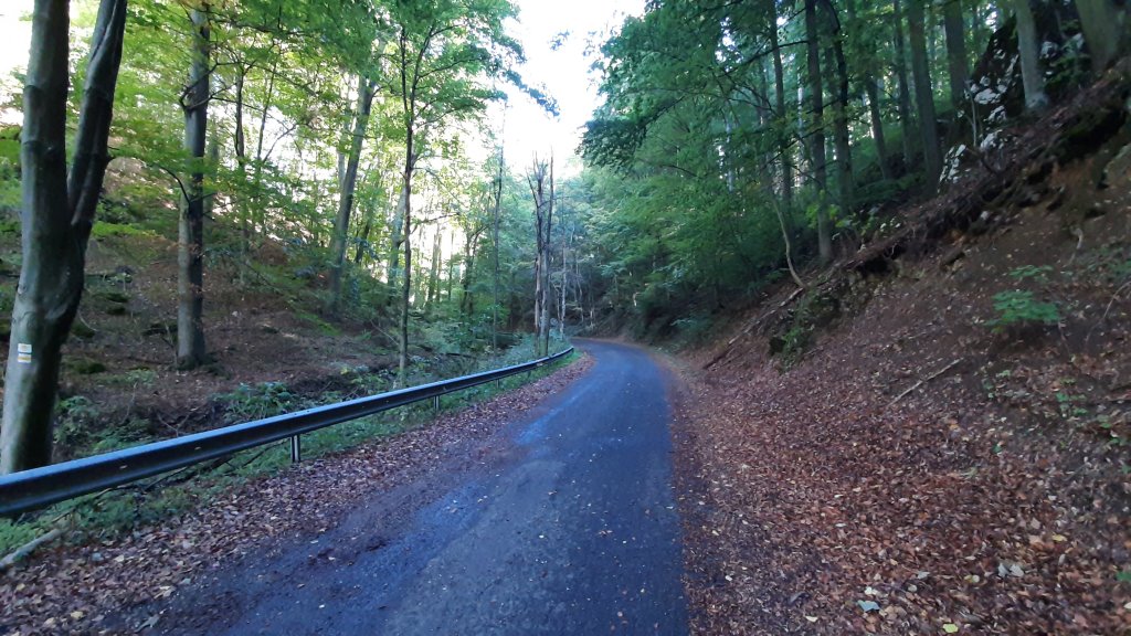 Egy könnyed, kevés kivétellel lefelé tartó erdei (aszfaltos) úton Kőris-hegyrő legurulunk Bakonybélbe. Elején kell csak figyelni az elágazásban jobbra tartunk.
