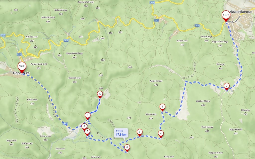Bükkszentkeresztről indulunk a térképen jelzett úton, ez még aszfaltotozott út. Közel 3 km után  jobbra letérünk egy jól járható földútra. Ezen tekerünk másfél km-t és balra újra aszfaltozott úton haladunk át egy nagy réten.  Fogunk találni egy turistaházat, itt tudunk picit pihenni. Megyünk tovább, itt hamarosan végetér az aszfaltozott utunk, egyenesen haladunk tovább a földúton. Innentől érdemes néha ránézni a térképre, mert van pár tévesztési lehetőség. Egy völgybe fogunk lejutni. Jobbra 1 km után eljutunk Üveghutára. Itt két fedett pihenő van kialakítva, egyikben egy régi kemencével.  Itt működött az utolsó bükki üveghuta 1897-ig. A falu a 1900-as évek elején még lakott volt, temetőjébe 1926-ban temették el az utolsó elhunytat. Innen visszafelé tekerünk, 1,5 km után jobbra felfelé indulunk meg. Ez az út már elvisz minket Répáshutára.