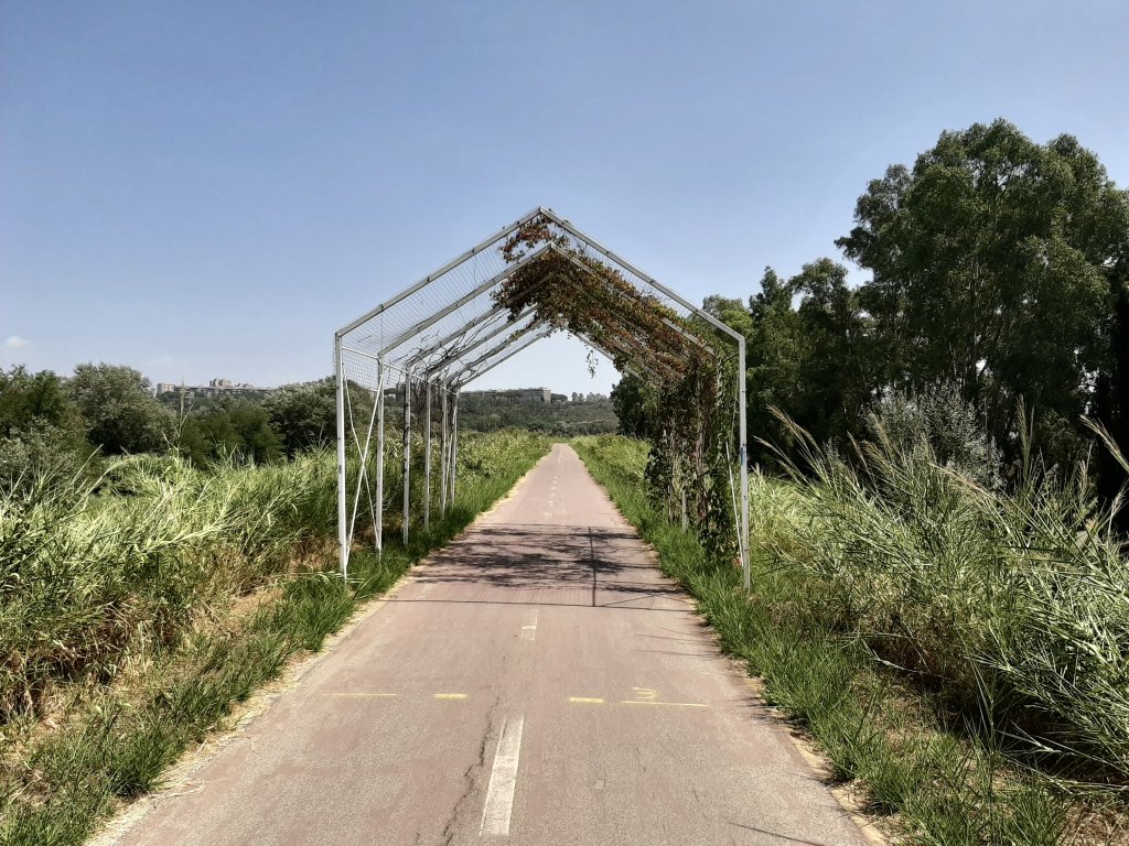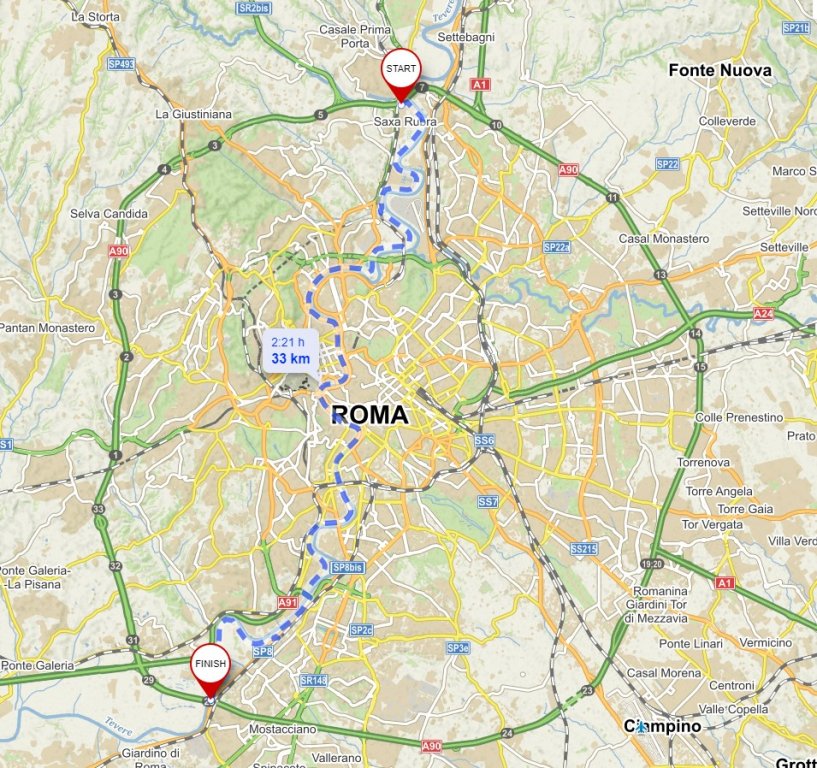 A kiválóan jelzett kerékpártúra a Tevere mentén, mely a Ponte di Castel Giubileonál kezdődik, melyen áthalad az A90-es autópálya valamint alatta hömpölyög Olaszország harmadik leghosszabb folyója a Tevere (latinul Tiberis), mely leginkább Róma folyójaként ismert. A Tevere az Appeninekben ered, majd 406 km-en keresztül kanyarog, míg végül a Tirrén-tengerbe torkollik Ostiánál. Az első szakaszon sportpályákon, klubokon, uszodákon haladunk át, jó minőségű kerékpárúton, majd részben gondozott, kissé elhanyagolt külvárosi területen folytatjuk utunkat Róma belvárosán át, egészen a Ponte di Mezzocamminonál található kerékpáros parkig. Fontos, hogy vizet bőven vigyünk magunkkal, ugyanis a kiindulási pontunkhoz képest, leghamarabb a belvárosban találunk majd ivókutat. A padok és pihenőhelyek elhanyagoltak, eső vagy nap elől nem védenek. A túra bármelyik irányból teljesíthető, oda-vissza tekerés esetén, az eredmény  kétszeresen számít.