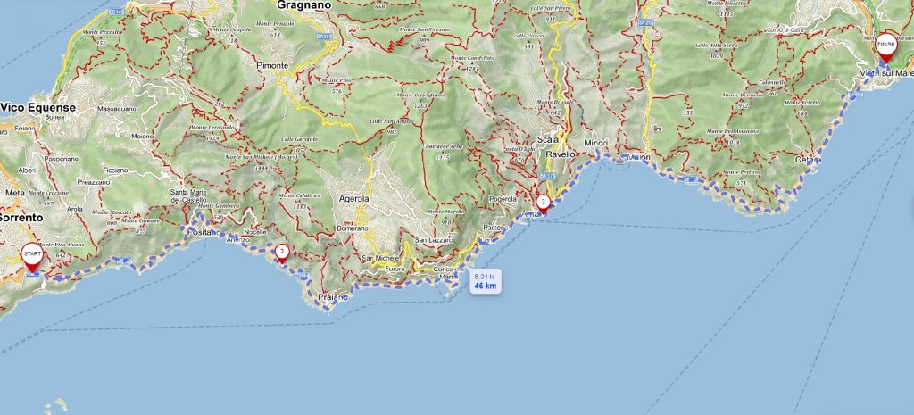 Kerékpártúránk Olaszország egyik legszebb részén halad át. A Sorrentó félsziget déli oldalán teljesítünk egy túrát. A túra sok emelkedőt tartalmaz, de látvány túlmutat a nehézségeken. Végig gyönyűrű tengerparton és városokon (Positano, Amalfi) haladunk át. Colli di San Pietroból indulunk ami elég magasan van, így túránk eleje elég könnyed lesz, utána emelkedők és gurulások váltják majd egymást utunk végéig. Az úton van forgalom mert az autósok és motorosok is szeretik ezt az utat, de nem lesz ettől kényelmetlen a kerékpározás. Túra Salerno előtt ér véget, mert Salerno már egy kimondottan forgalmas város. Persze belehet gurulni a városba, meg a tengerpartra is. Az útvonal könnyű mert sehol nem kell letérnünk az útról.